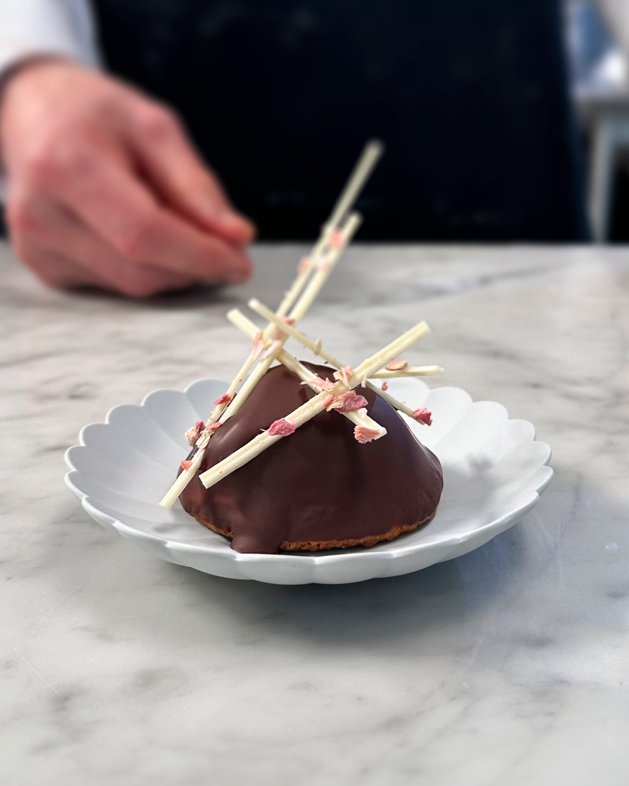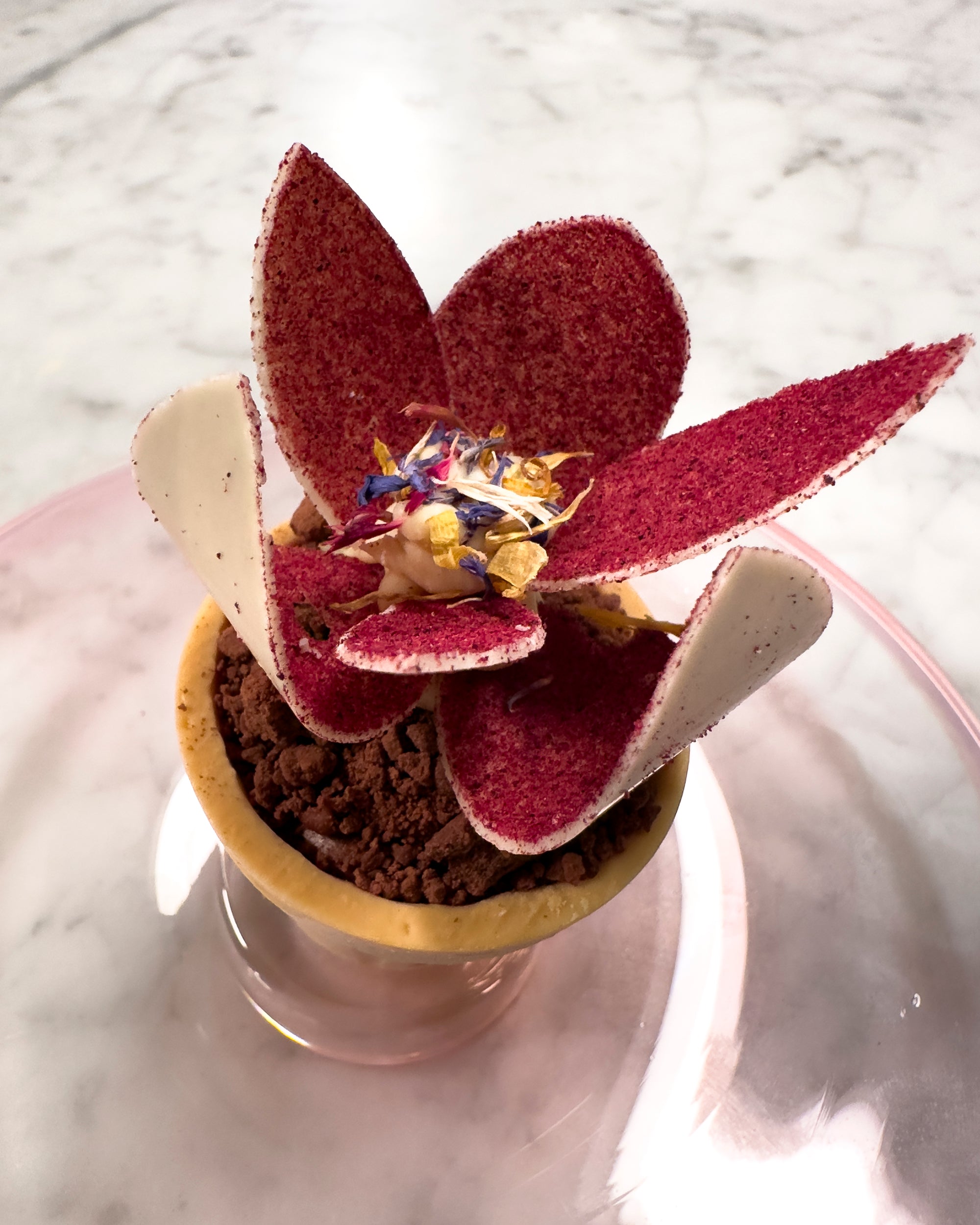 Af Summerbird Organic 7. Marts 2025Amber-urtepotte med krystalliseret chokolade og chokoladeblomst