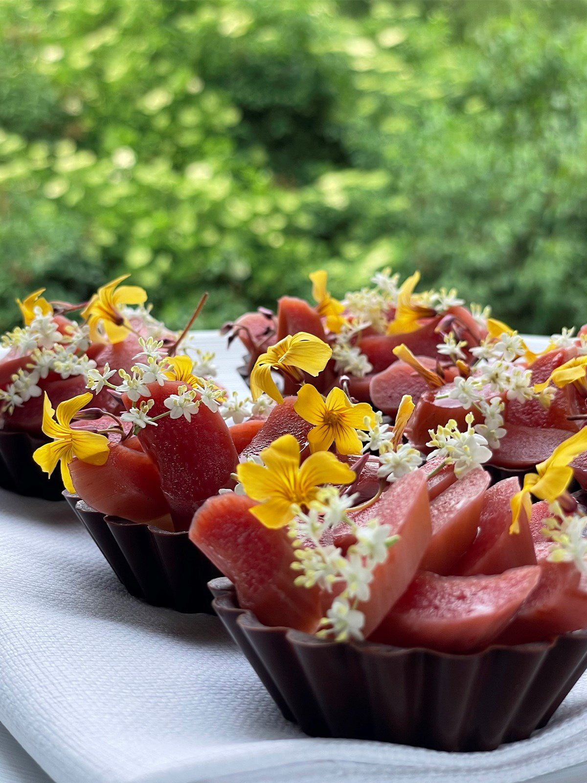 Af Summerbird Organic 15. Marts 2023Tærte på mørk Arriba Nacional 68%-chokolade passionscurd & marengs