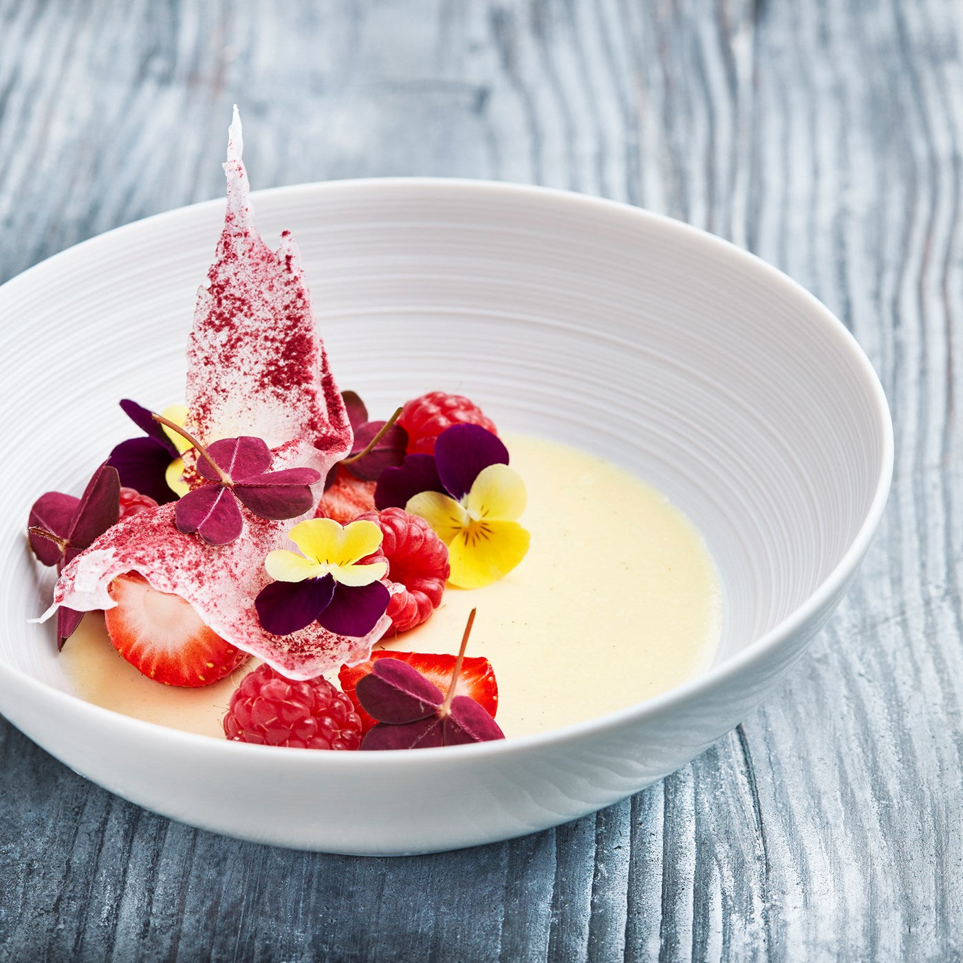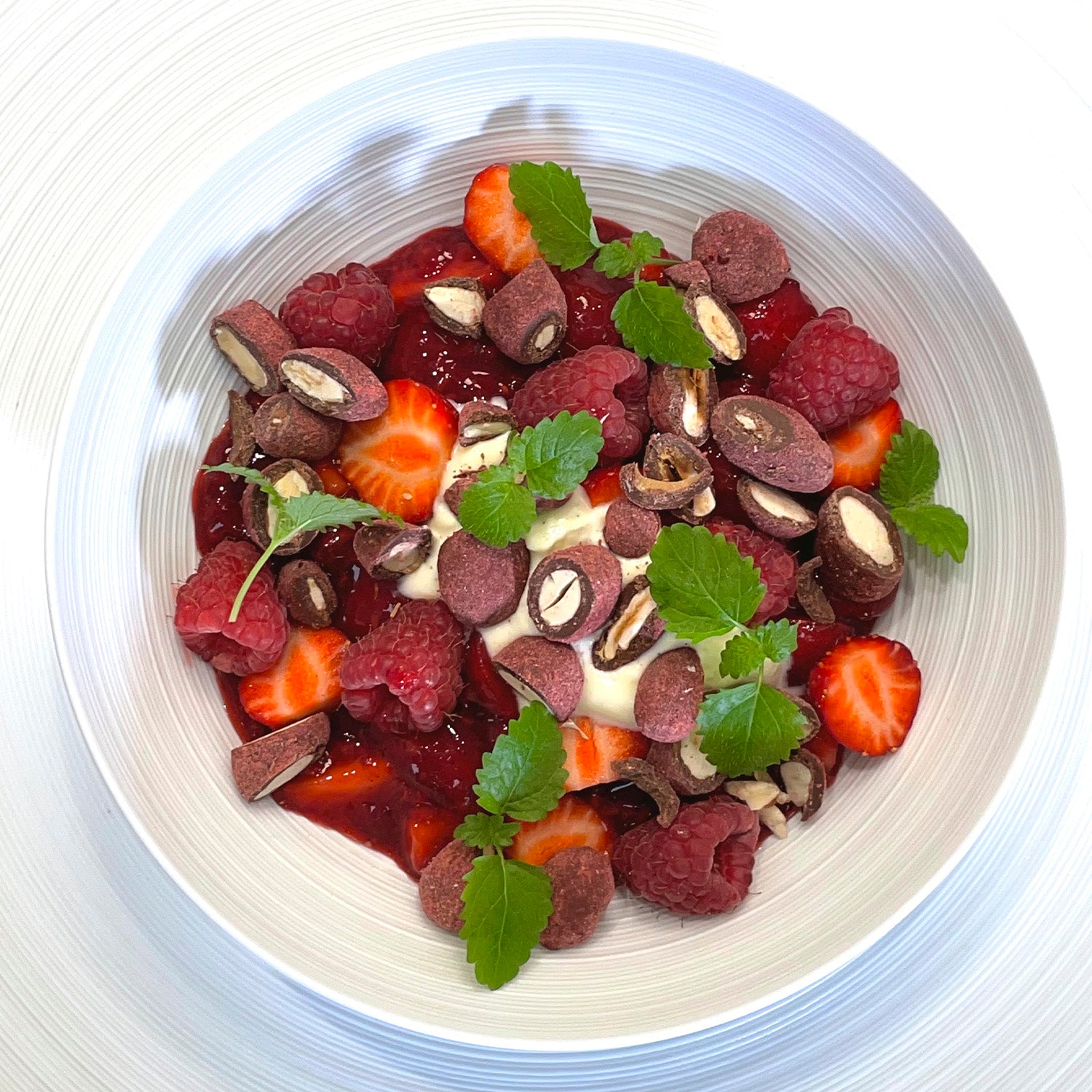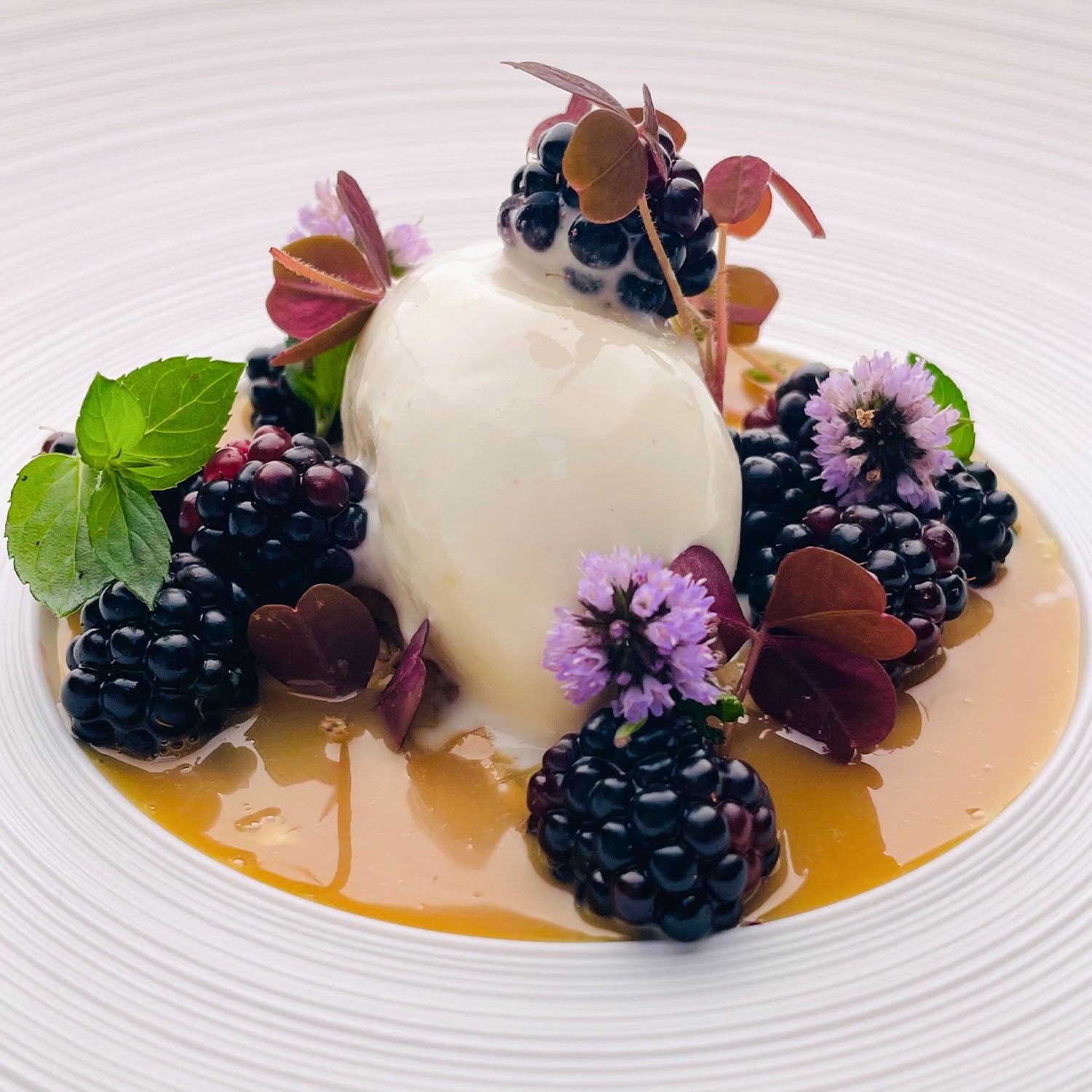 Af Summerbird Organic 8. Marts 2023Klassisk vaniljeis, Amber-sauce & syltede brombær
