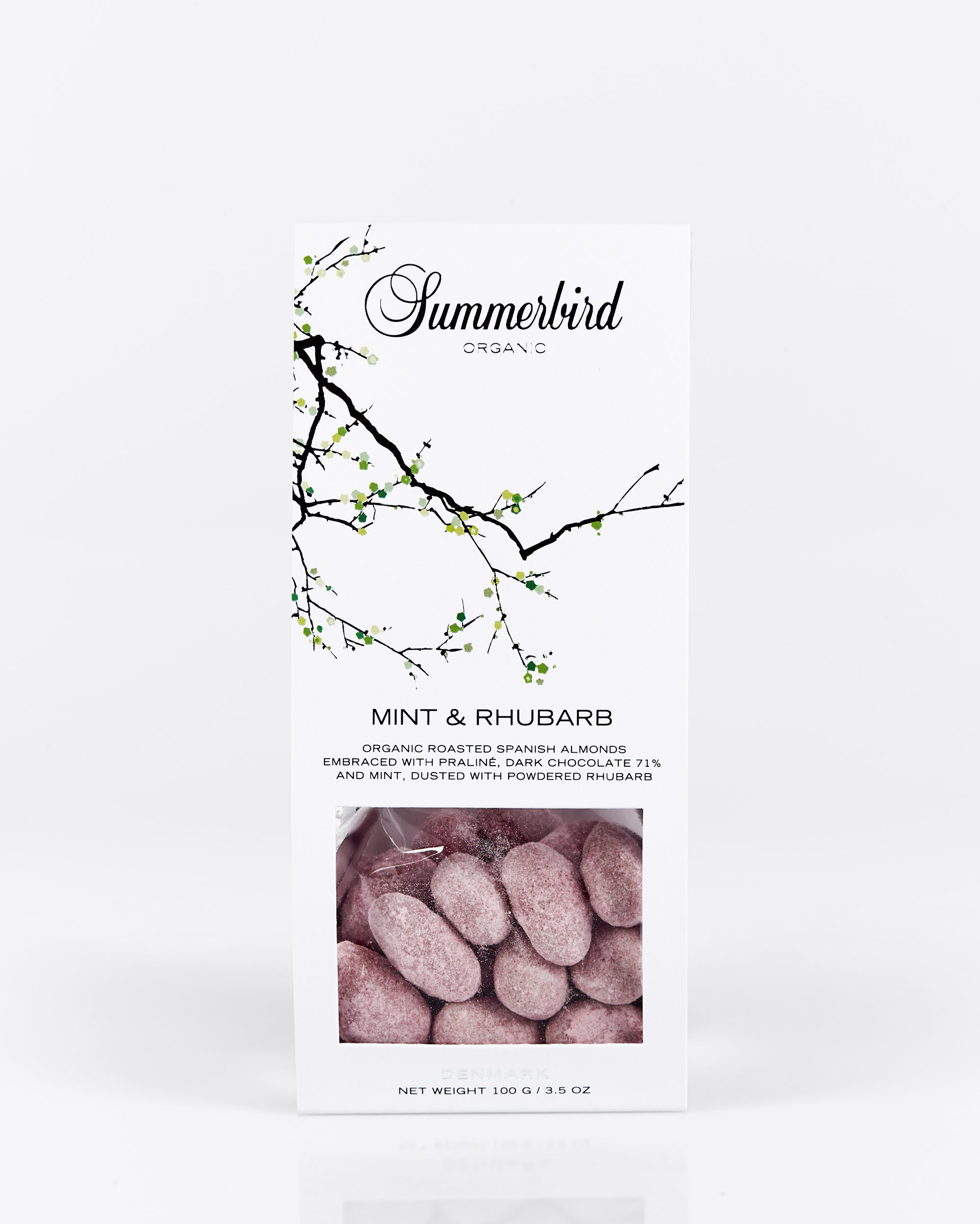 Let ristede spanske mandler, praliné, mørk chokolade Guayas 71 %, mynte og rabarber.