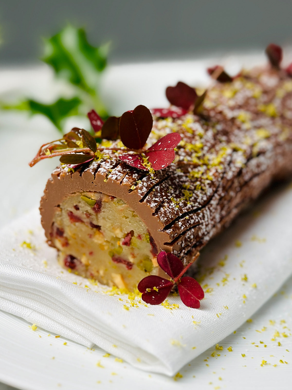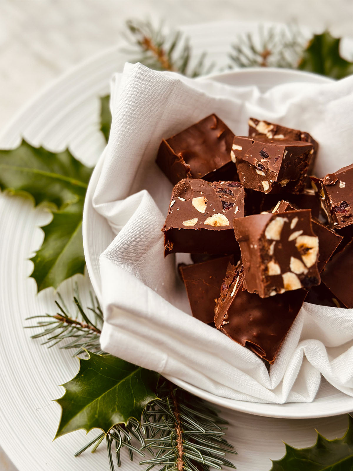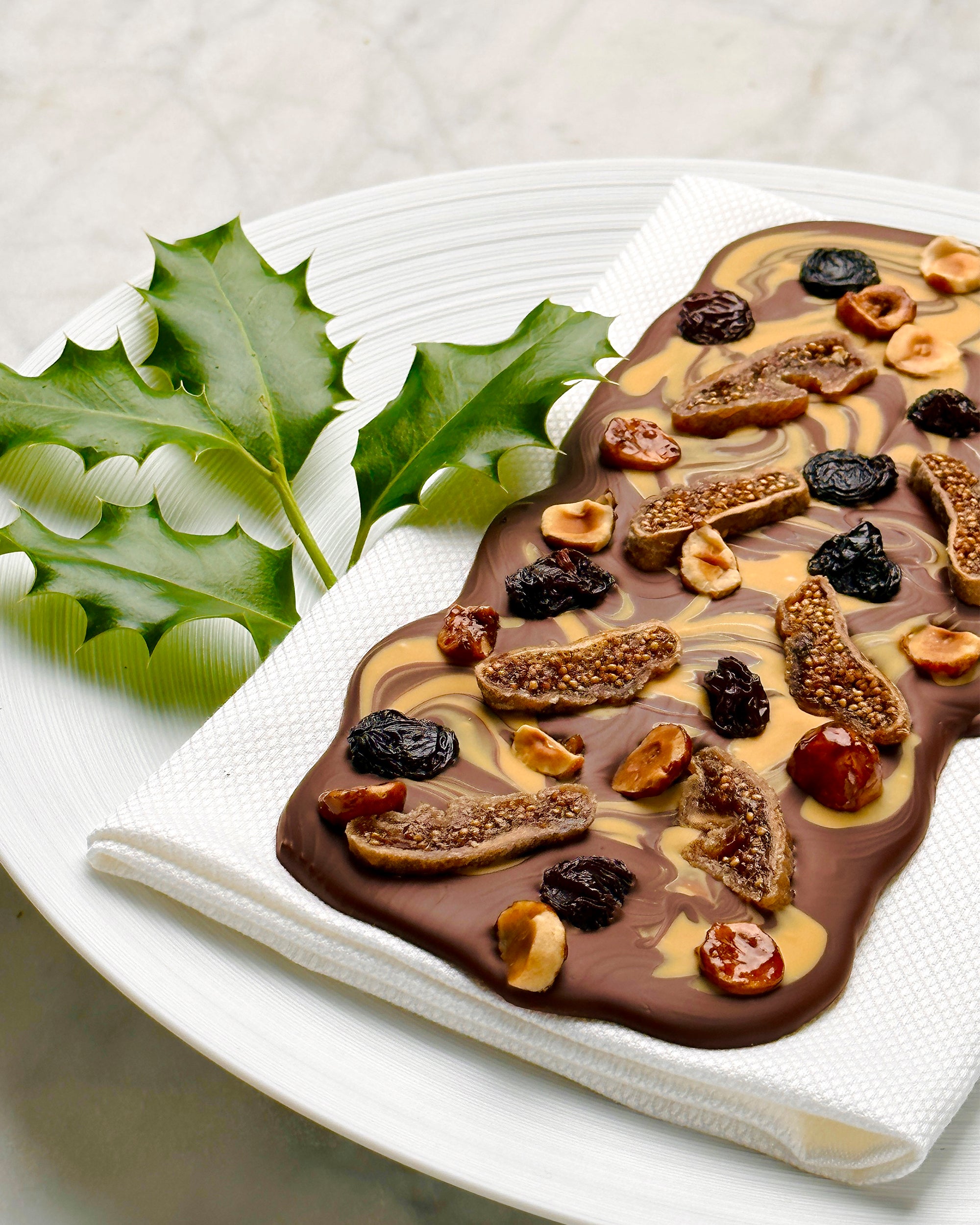 Let ristede italienske hasselnødder, praliné, Amber Noir-chokolade og brombær
